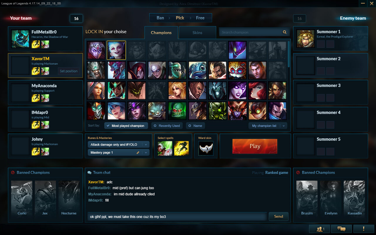 All I did was to open a screenshot of the champion select screen Riot was using back then on one monitor and Photoshop on the other and started reworking the UI a little. I had a few general goals: