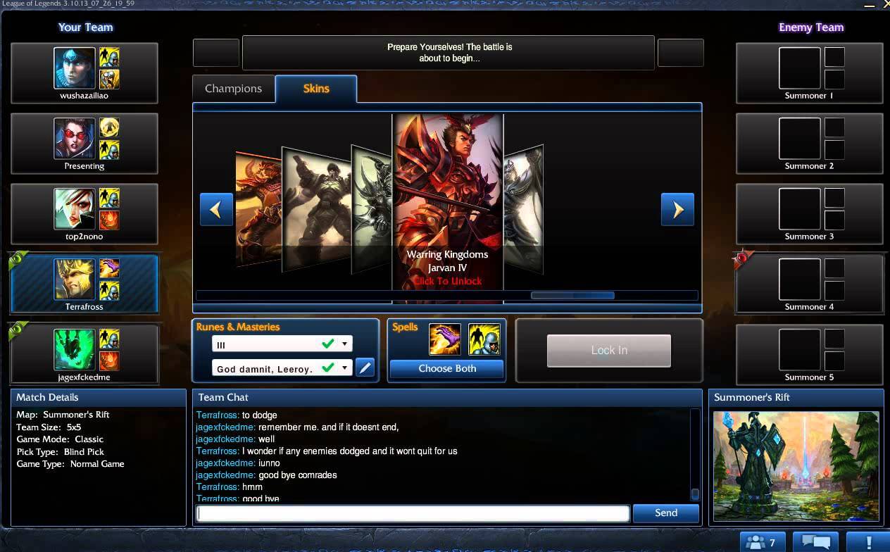 What wasn’t looking good however was the champion select screen. This is the place where each player picks his champion, chats with his team and select his set of “special spells”. It is a non-fullscreen window in which everyone stays between two and five minutes (and doesn’t play, duh..).